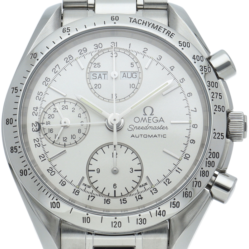 オメガの人気ウォッチ「スピードマスター」。クロノグラフ、月・日・曜日表示機能がついた便利な多機能ウォッチ。