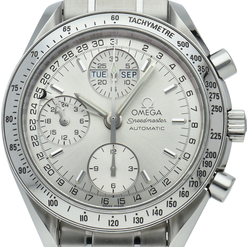 オメガの人気ウォッチ「スピードマスター」。クロノグラフ、月・日・曜日表示機能がついた便利な多機能ウォッチ。