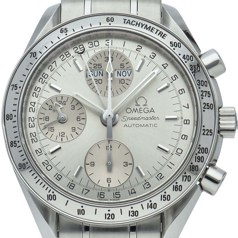 オメガの人気ウォッチ「スピードマスター」。クロノグラフ、月・日・曜日表示機能がついた便利な多機能ウォッチ。