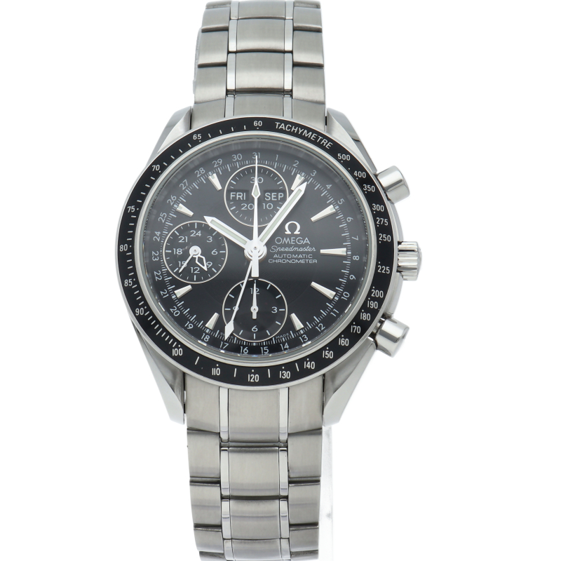 オメガの人気「スピードマスター」。クロノグラフ、月・日・曜日表示機能がついた便利な多機能ウォッチ。モデルチェンジに伴い高級感がアップした1本。