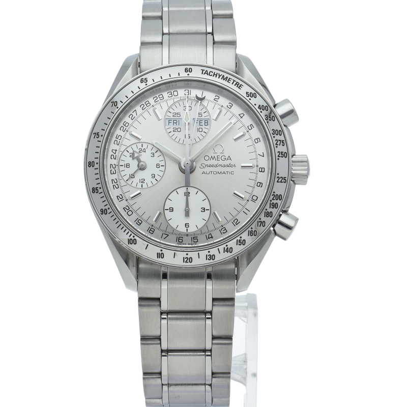 オメガの人気ウォッチ「スピードマスター」。クロノグラフ、月・日・曜日表示機能がついた便利な多機能ウォッチ。