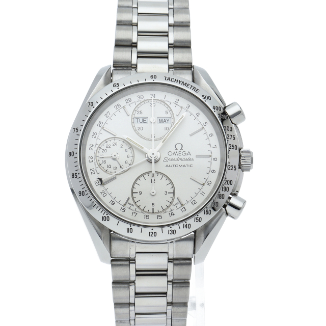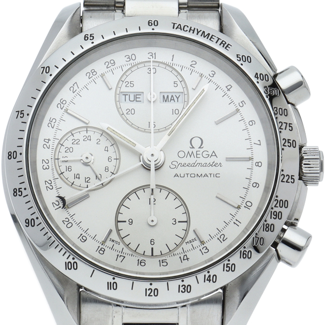 オメガの人気ウォッチ「スピードマスター」。クロノグラフ、月・日・曜日表示機能がついた便利な多機能ウォッチ。