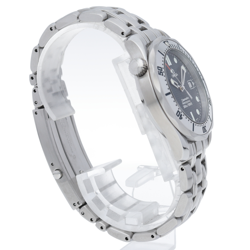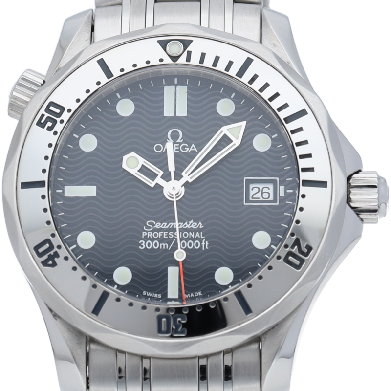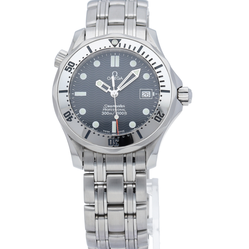 オメガを代表する人気ダイバーズウォッチ「シーマスター」。300mの防水性能を備え、文字盤には青い波の模様が入った実用性の高いベーシックなモデルです。