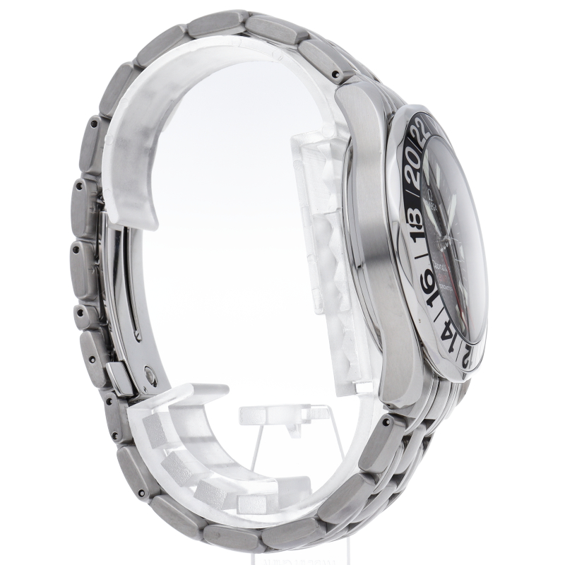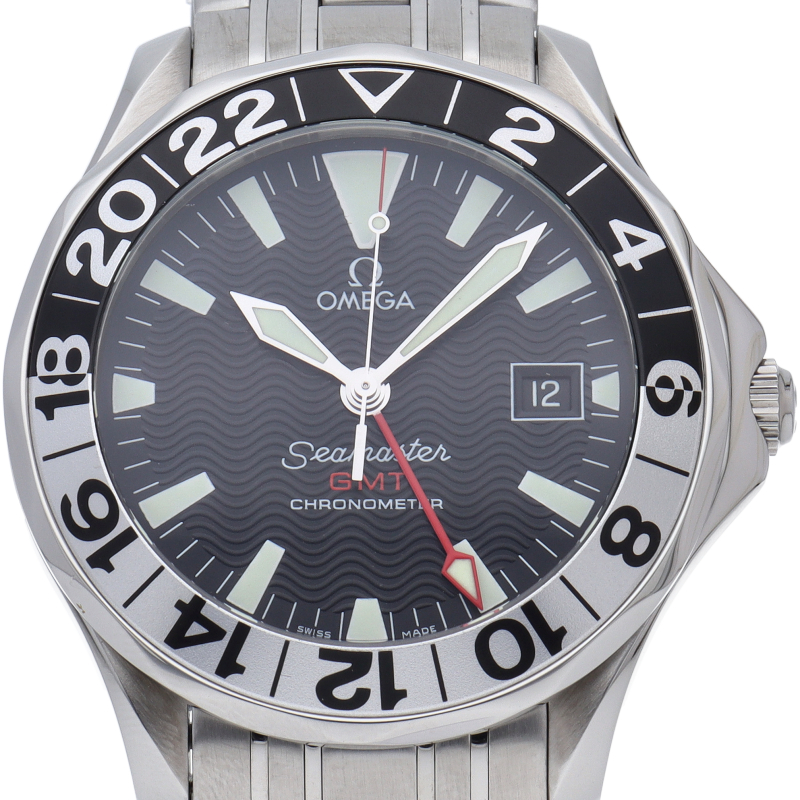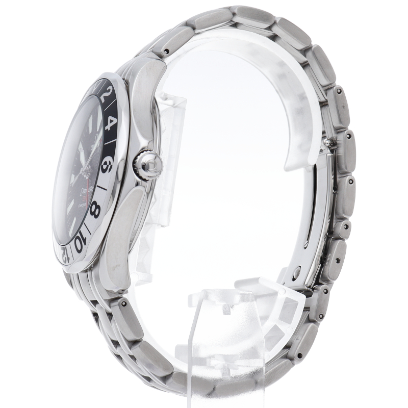 オメガを代表する人気ダイバーズウォッチ「シーマスター」の50周年記念モデル。広い層を満足させられるしっかりとした内容と、コストパフォーマンスの良さがひかります。こちらのモデルもこの販売価格ながら、3タイム表示GMT機能まで付いた優れものです。