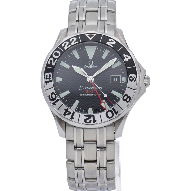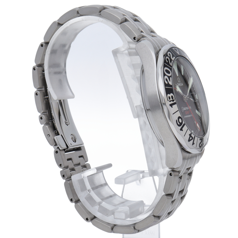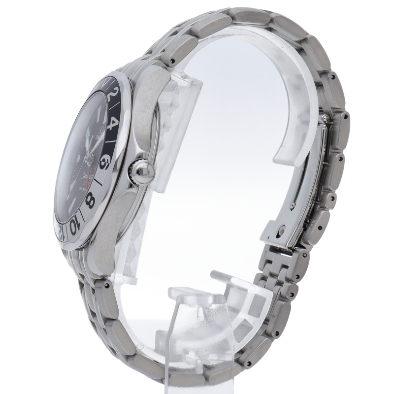 オメガを代表する人気ダイバーズウォッチ「シーマスター」の50周年記念モデル。広い層を満足させられるしっかりとした内容と、コストパフォーマンスの良さがひかります。こちらのモデルもこの販売価格ながら、3タイム表示GMT機能まで付いた優れものです。