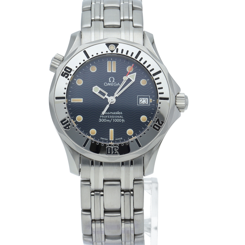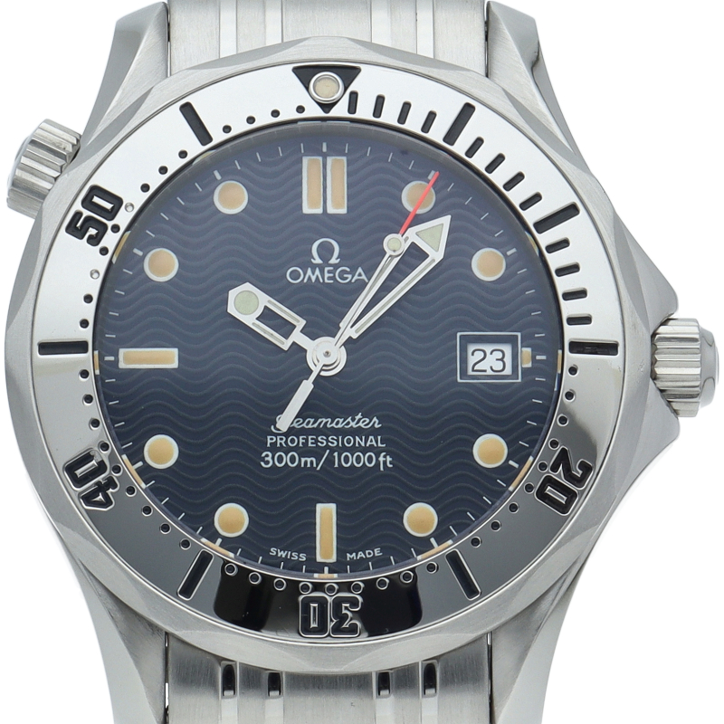 オメガを代表する人気ダイバーズウォッチ「シーマスター」。300mの防水性能を備え、文字盤には青い波の模様が入った実用性の高いベーシックなモデルです。