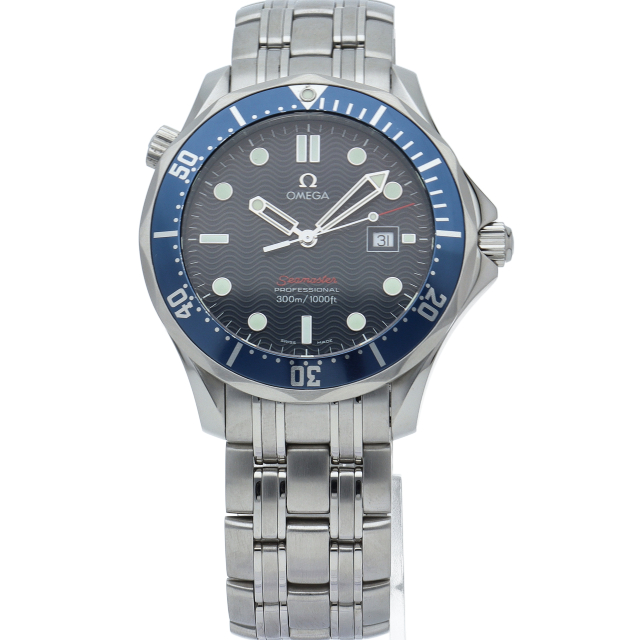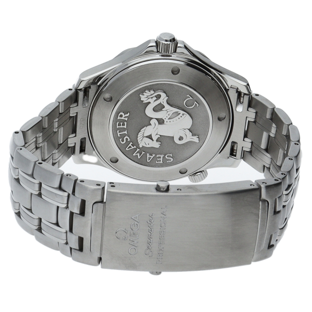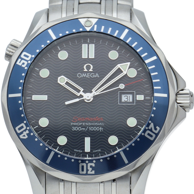 オメガを代表する人気ダイバーズウォッチ「シーマスター」。逆回転防止ベゼル・デイト表示機能等が搭載された本格派ダイバーズウォッチです。仕様変更により文字盤のシーマスターの文字が赤字に変更されております。