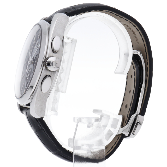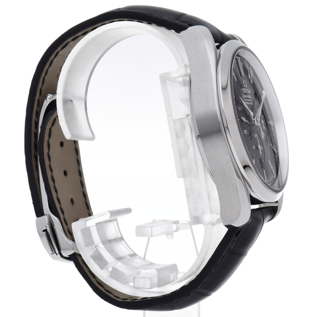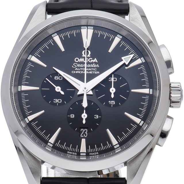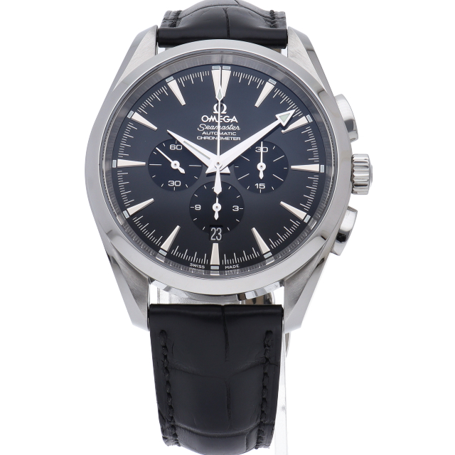 ブラックダイヤルに凹型インダイヤルをスッキリ備えた厚さ14ミリの42ミリ150m防水ケースにブラックアリゲーターベルトを合わせたアクアテラは、実用性に優れたタフなつくりと高級感漂うスポーティなデザインが男性の腕に大人の洗練を香らせるオメガ人気のクロノグラフ。