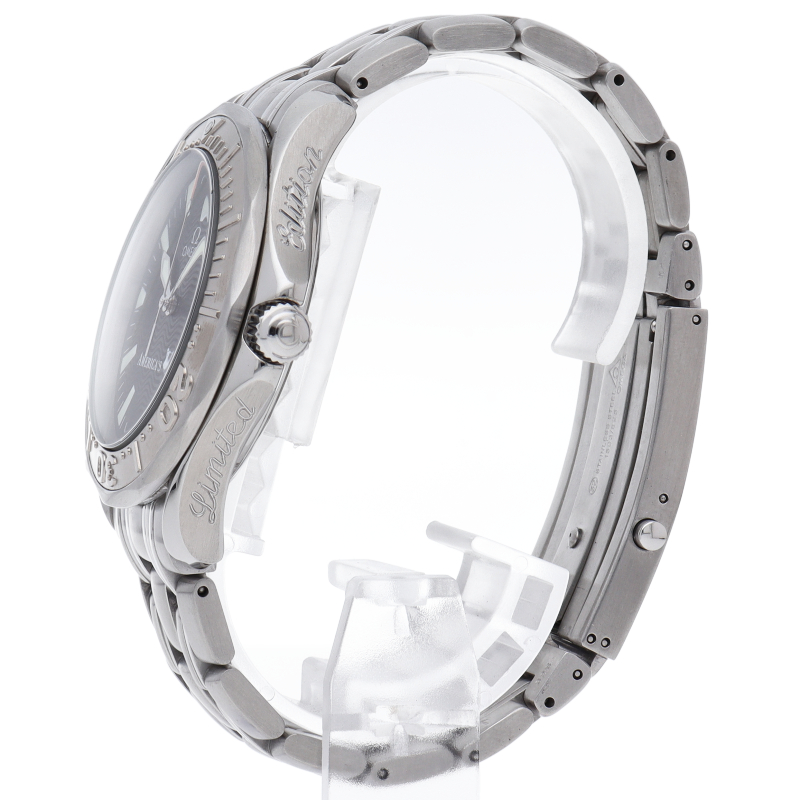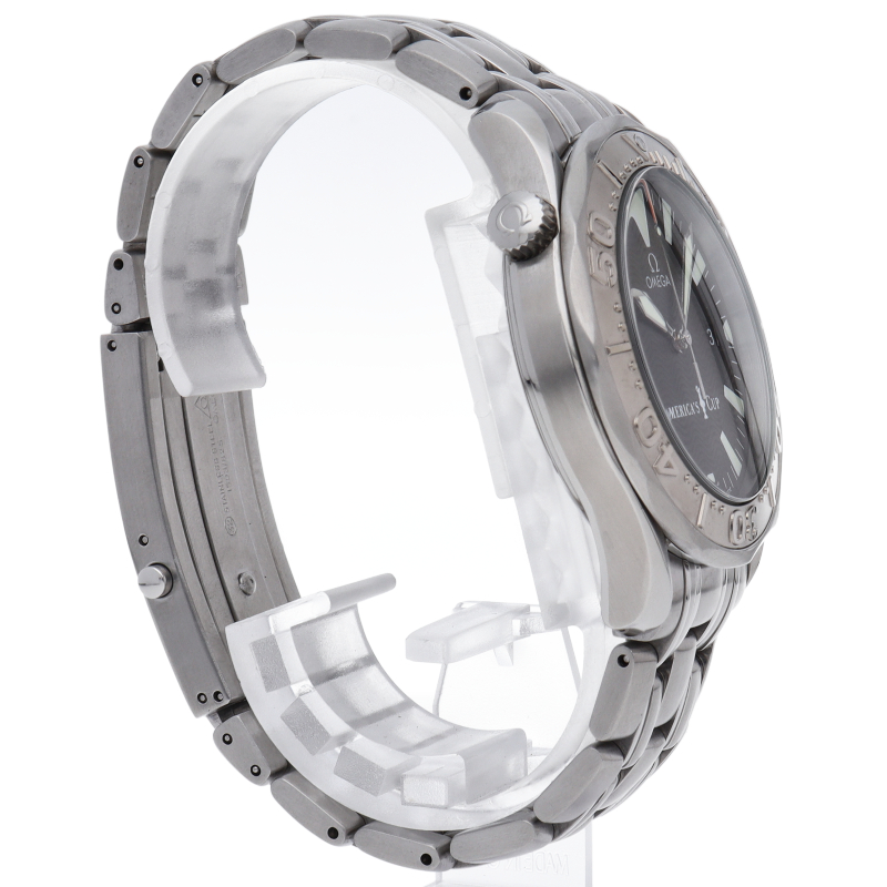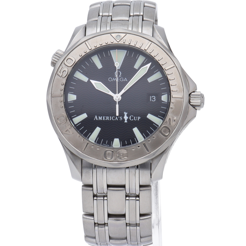 オメガを代表する人気ダイバーズウォッチ「シーマスター」。逆回転防止ベゼル・デイト表示機能等が搭載された本格派ダイバーズウォッチです。アメリカズカップのロゴが文字盤部分に入っ限定9999本の希少なモデルです。