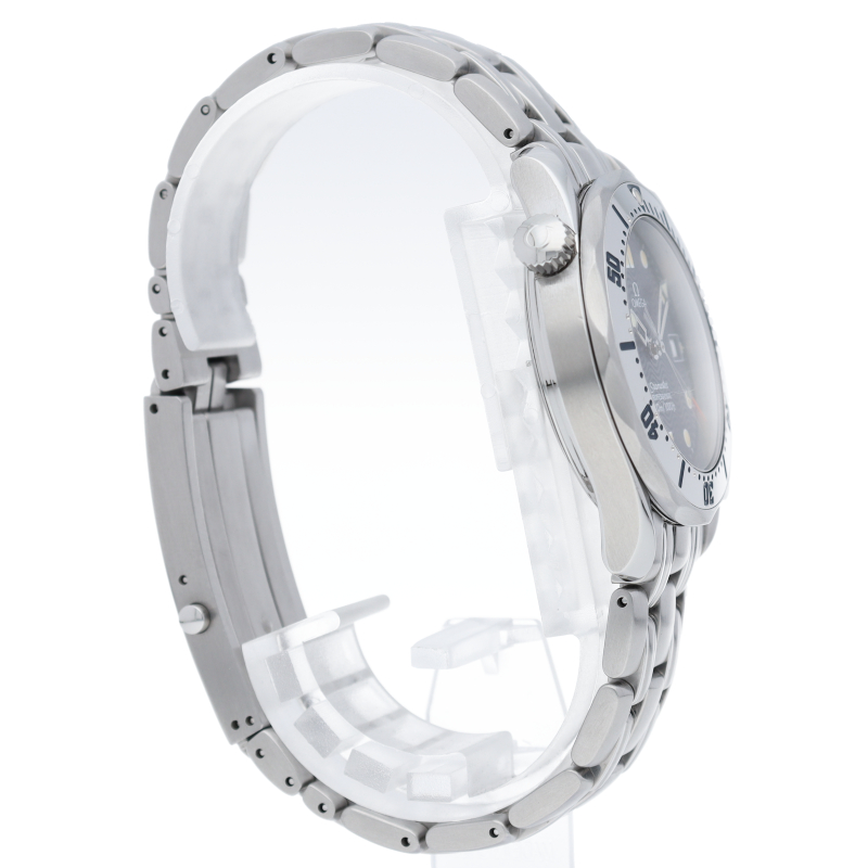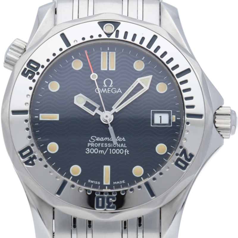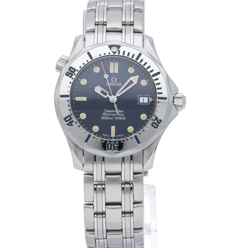 オメガを代表する人気ダイバーズウォッチ「シーマスター」。300mの防水性能を備え、文字盤には青い波の模様が入った実用性の高いベーシックなモデルです。