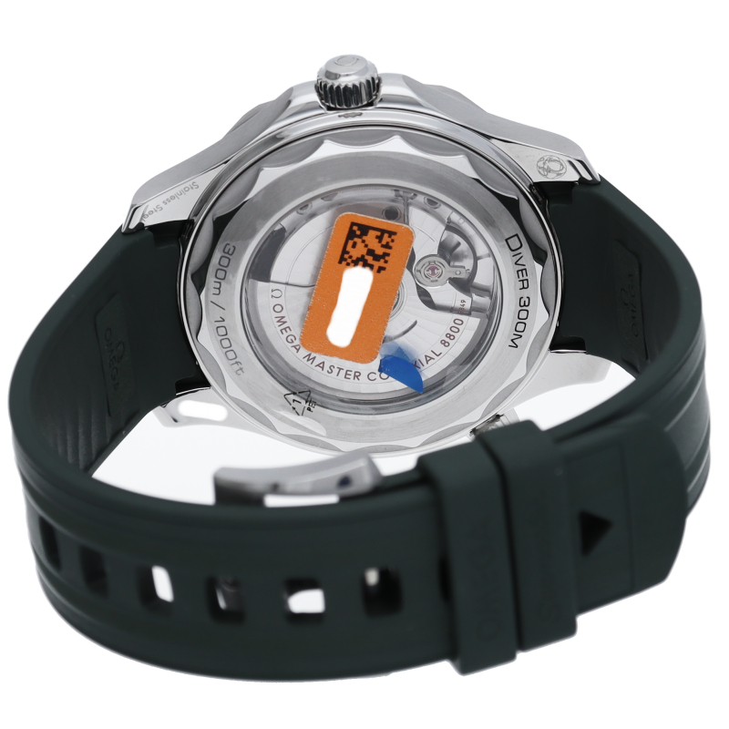 「シーマスター ダイバー300M」は、1993年の発売以来、伝説的な支持を誇っています。ホワイトエナメルでダイビングスケールを描いたグリーンセラミック製ベゼルが付いています。オメガ マスター クロノメーター キャリバー 8800が搭載され、波模様で縁取られたケースバックのサファイアクリスタルガラス越しに眺めることができます。