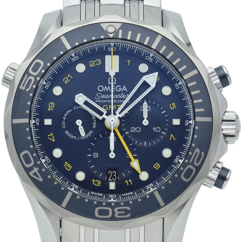 この「シーマスター プロダイバーズ 300M クロノグラフ GMT」は、30分積算計および12時間積算計とスモールセコンドダイアルを搭載したマットブルーのダイアルが特徴です。ダイアルには、イエローのGMT針に合わせてイエローの24時間スケールを搭載。このスケールはセカンドタイムゾーンで経過時間を計測するときに利用できます。
