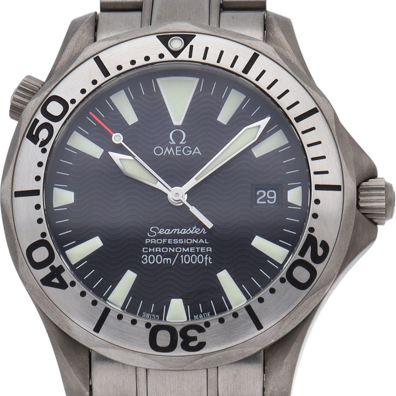 オメガを代表する人気ダイバーズウォッチ「シーマスター」。逆回転防止ベゼル・デイト表示機能等が搭載された本格派ダイバーズウォッチです。チタン素材を採用しておりますので、軽く強くダイバーウォッチにはおすすめの一本です。