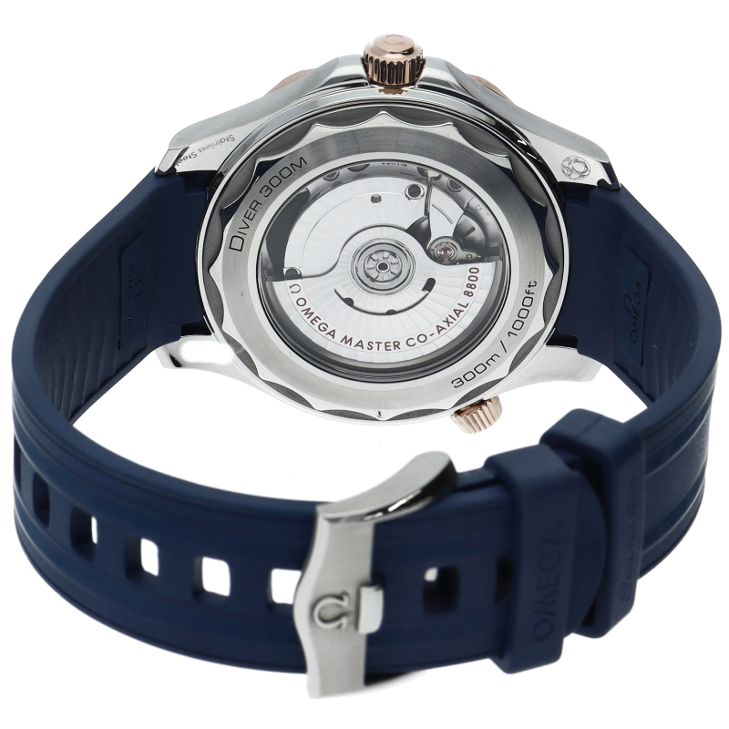 1993年の発売以来伝説的な支持を誇っている「シーマスター ダイバー 300M」。こちらのモデルはオメガ マスター クロノメーター キャリバー 8800が搭載され、波模様で縁取られたサファイア・クリスタルのケースバックから眺めることができます。