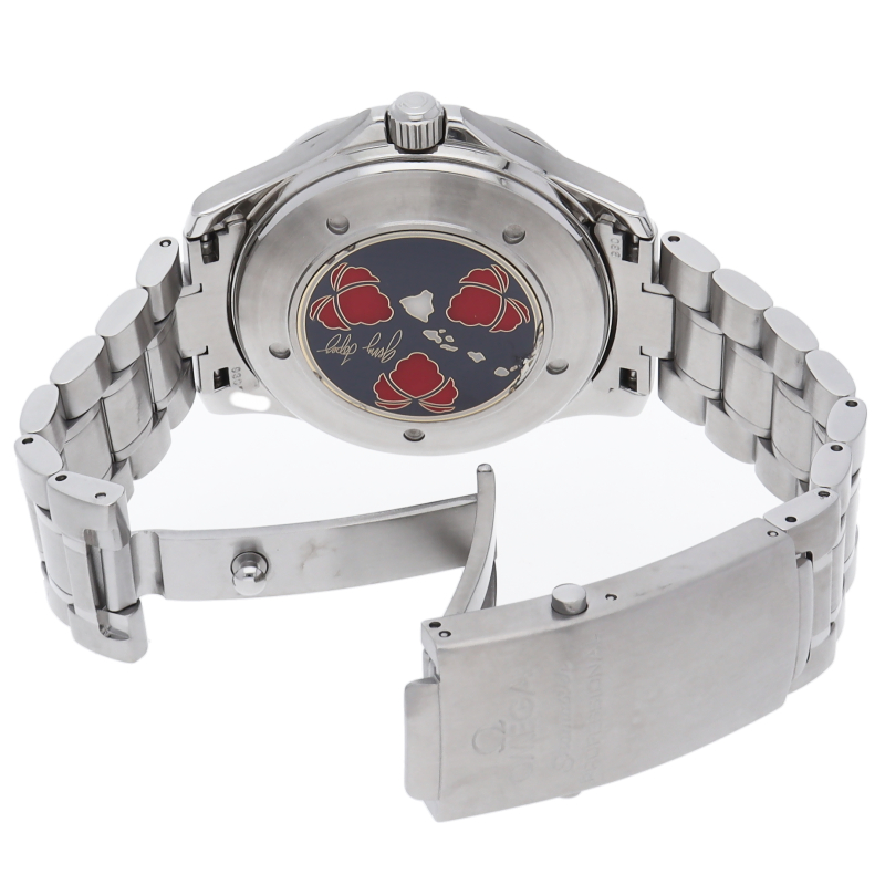 オメガを代表する人気ダイバーズウォッチ「シーマスター」。裏蓋にはサーフィンの神様と呼ばれる ジェリー・ロペスが生まれたハワイ諸島とハイビスカスの絵柄が描かれジェリーロペスのサインの入った裏蓋が波乗りにはたまらないデザインの腕時計です。
