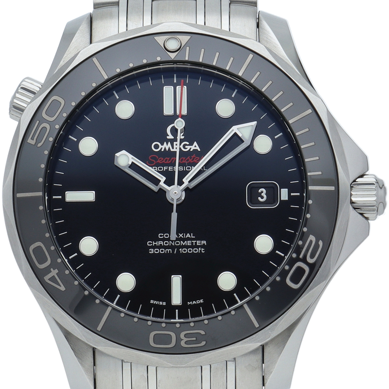 オメガを代表する人気ダイバーズウォッチ「シーマスター」。逆回転防止ベゼル・デイト表示機能等が搭載された本格派ダイバーズウォッチです。ベゼルが傷のつきにくいセラミック仕様に変更されました。