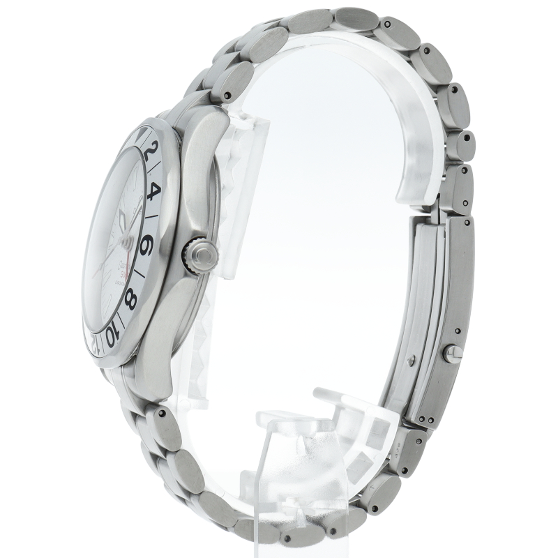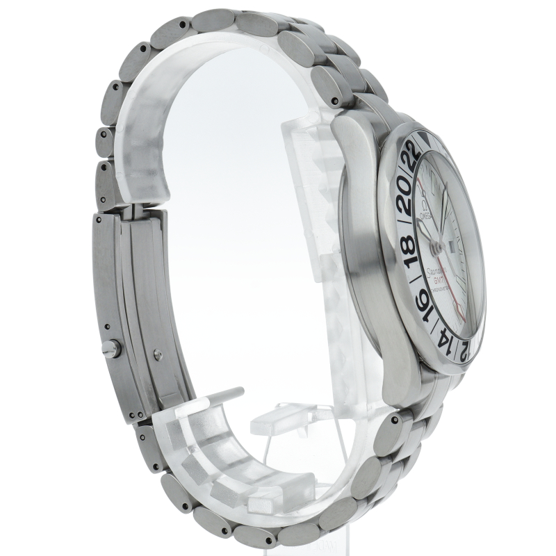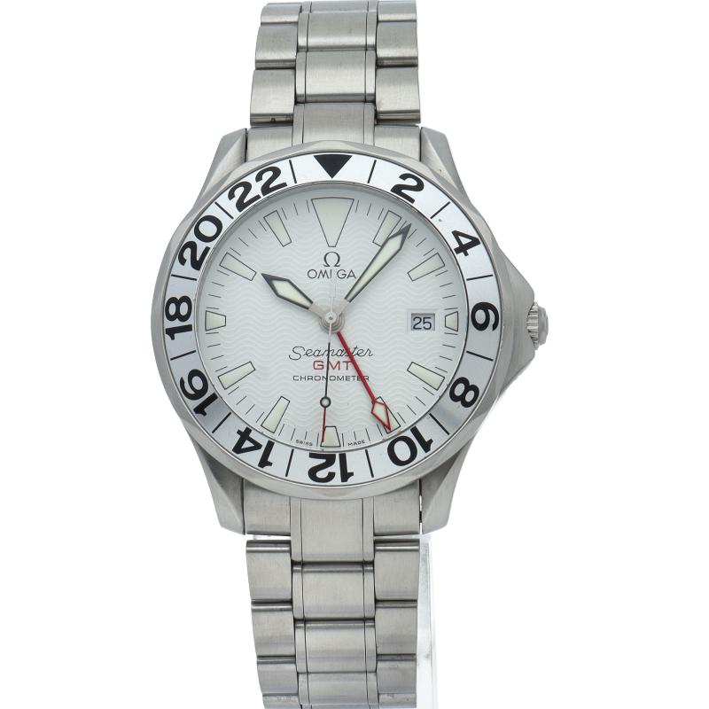 オメガを代表する人気ダイバーズウォッチ「シーマスター」。シーマスター初のGMTモデルとして登場。大型のベゼルには24時間表記が入るツートン表示(黒ダイヤルのみ)で、24時間針は赤く塗られ目立つように工夫が施されています。