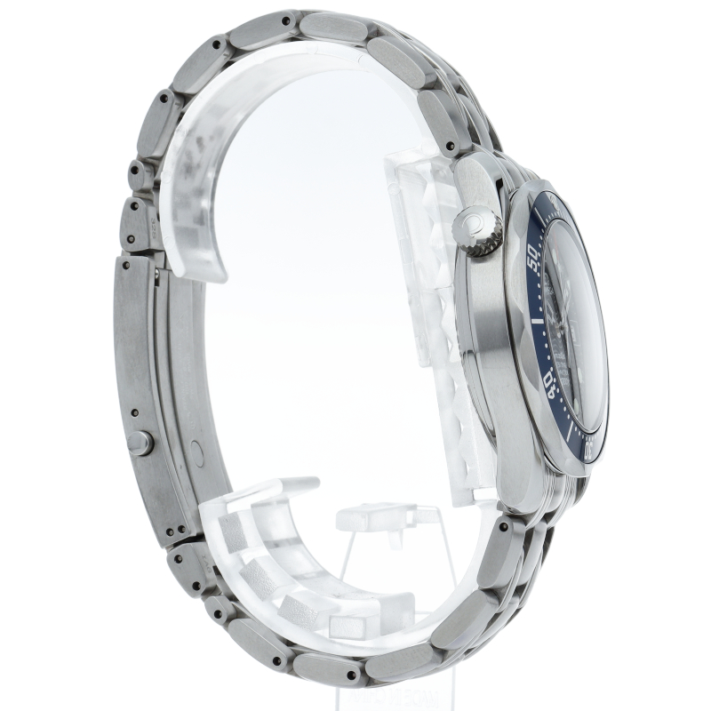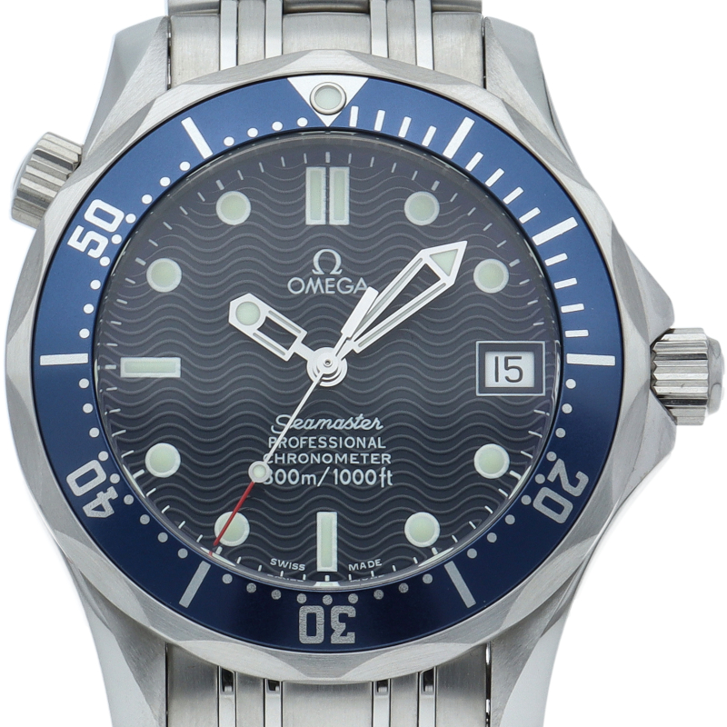 オメガを代表する人気ダイバーズウォッチ「シーマスター」。300mの防水性能を備え、文字盤には青い波の模様が入った実用性の高いベーシックなモデルです。