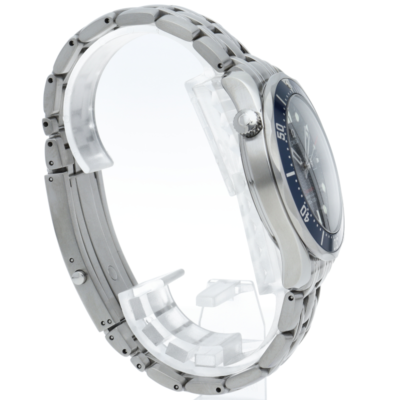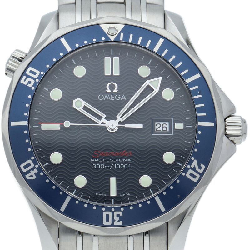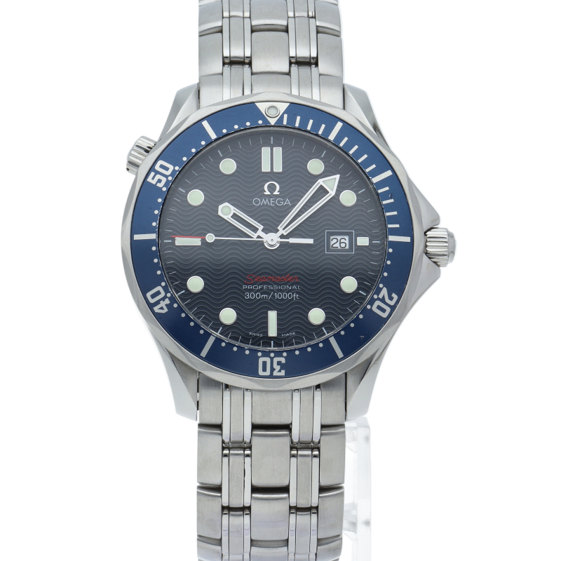 オメガを代表する人気ダイバーズウォッチ「シーマスター」。逆回転防止ベゼル・デイト表示機能等が搭載された本格派ダイバーズウォッチです。仕様変更により文字盤のシーマスターの文字が赤字に変更されております。