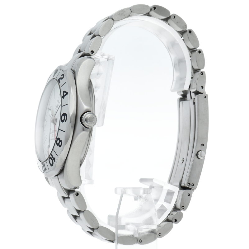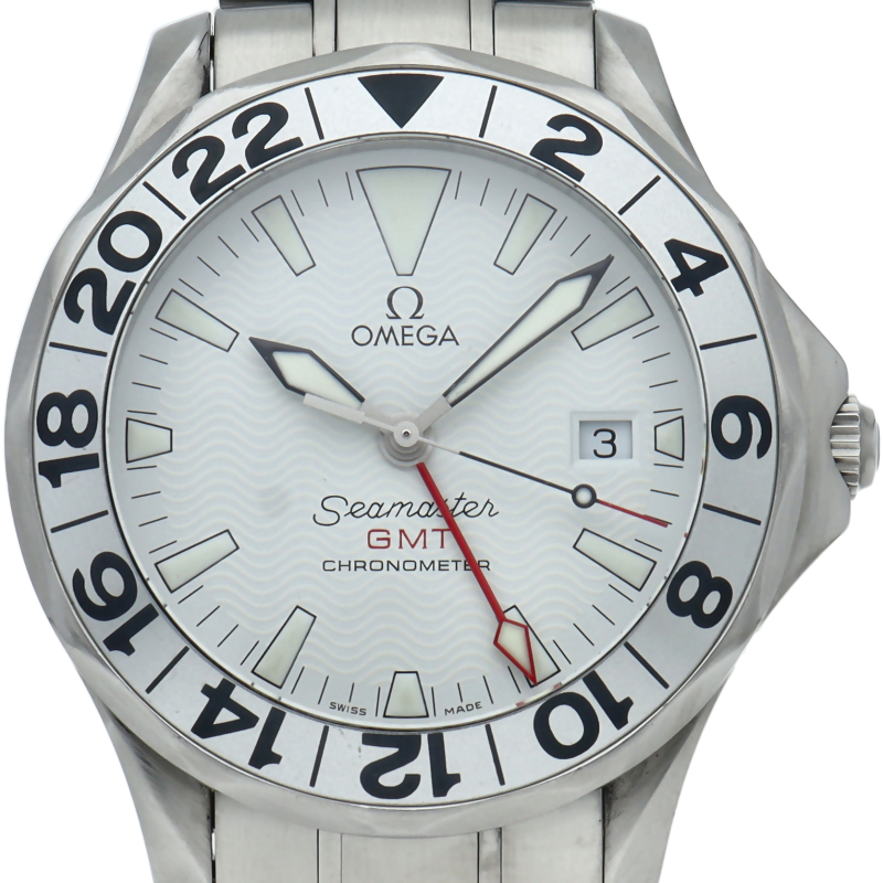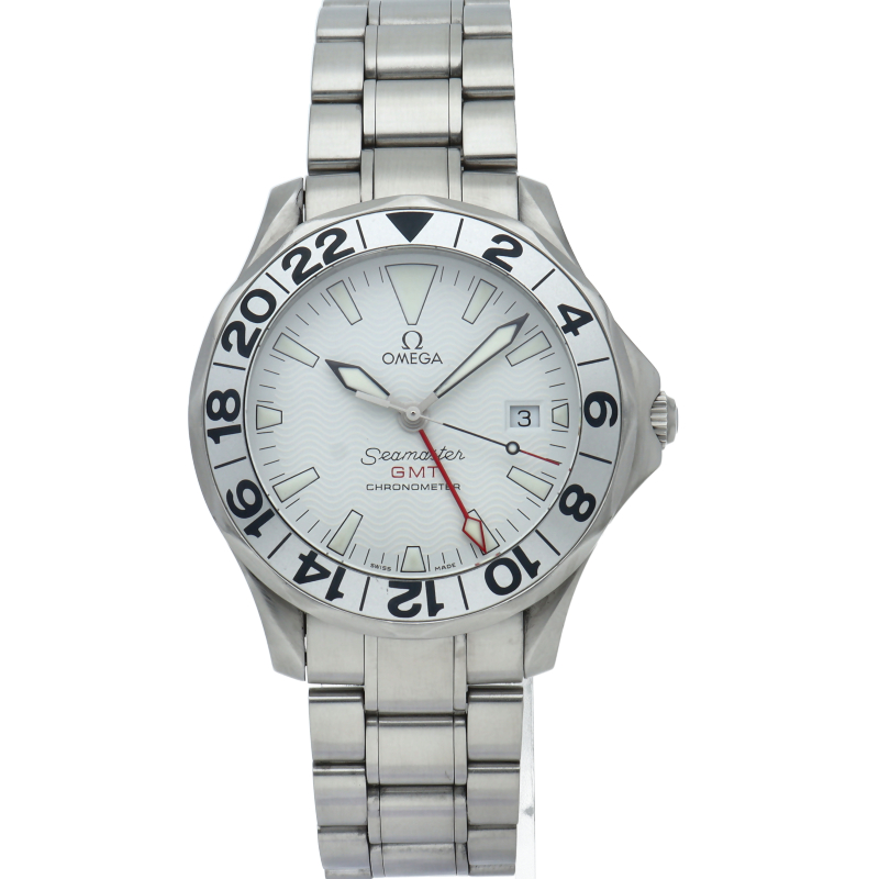 オメガを代表する人気ダイバーズウォッチ「シーマスター」。シーマスター初のGMTモデルとして登場。大型のベゼルには24時間表記が入るツートン表示(黒ダイヤルのみ)で、24時間針は赤く塗られ目立つように工夫が施されています。