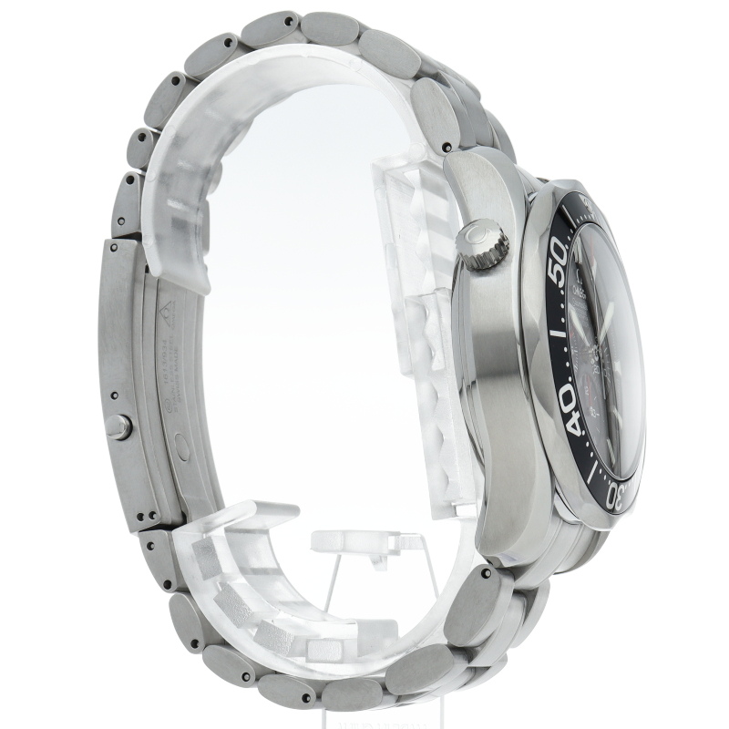 オメガを代表する人気ダイバーズウォッチ「シーマスター」。マットなシルバーブレス、バックルには、エクステンションパーツとダブルプッシュ式を採用。ウエットスーツの上からでも着脱が容易です。