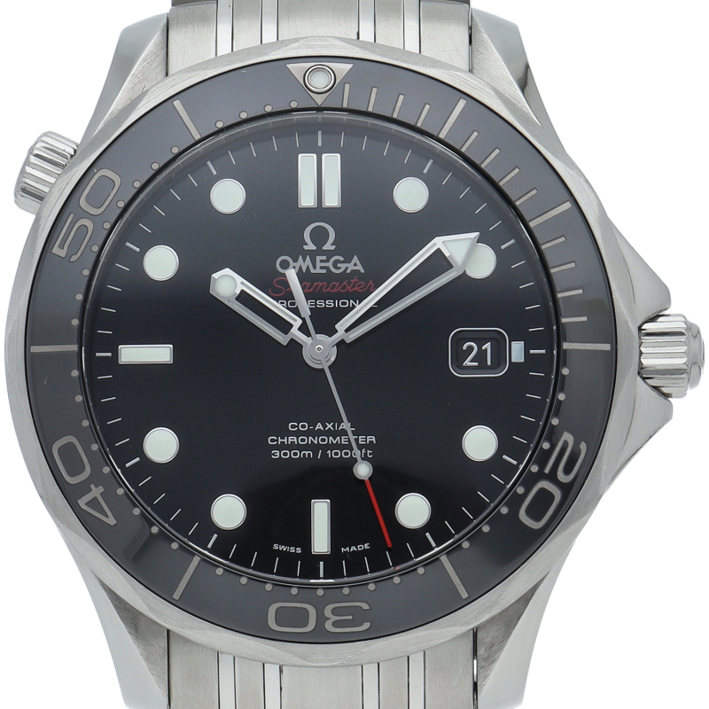 オメガを代表する人気ダイバーズウォッチ「シーマスター」。逆回転防止ベゼル・デイト表示機能等が搭載された本格派ダイバーズウォッチです。ベゼルが傷のつきにくいセラミック仕様に変更されました。