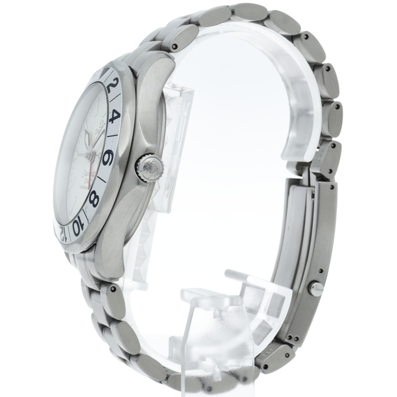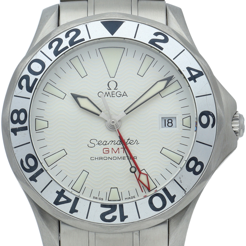 オメガを代表する人気ダイバーズウォッチ「シーマスター」。シーマスター初のGMTモデルとして登場。大型のベゼルには24時間表記が入るツートン表示(黒ダイヤルのみ)で、24時間針は赤く塗られ目立つように工夫が施されています。