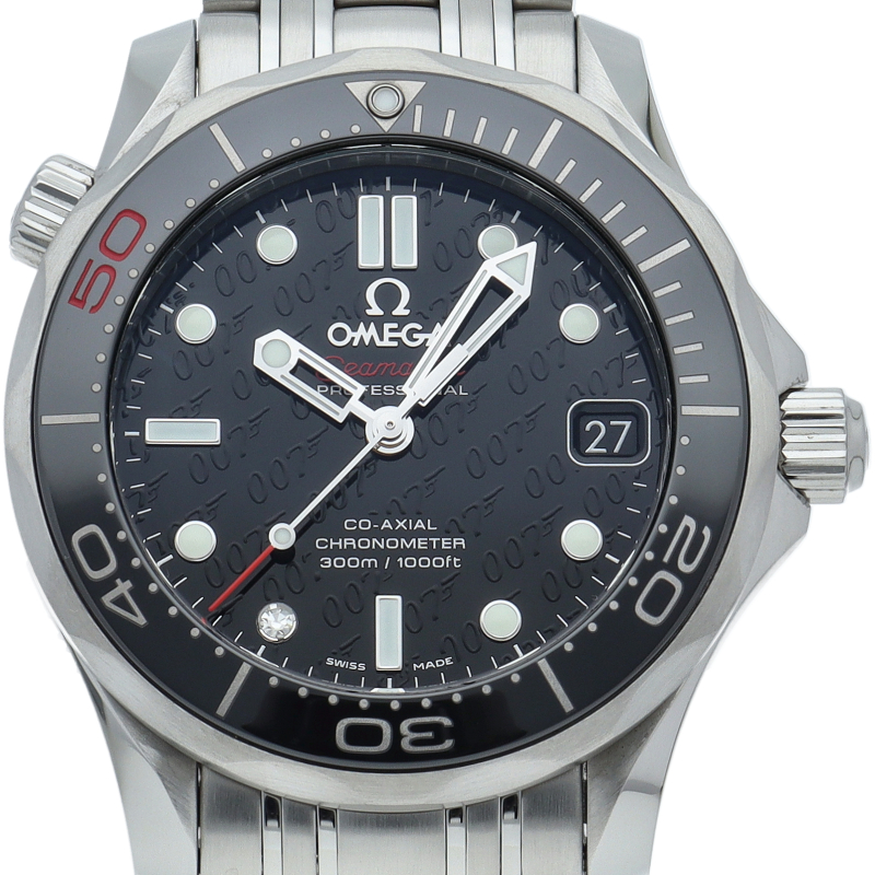 オメガを代表する人気ダイバーズウォッチ「シーマスター」。ジェームズ・ボンドが初めて登場してから50周年になるのを記念するものです。3007本の限定生産でブラックのダイアルに、対角線上にあしらわれたジェームズ・ボンド007のロゴと3時位置の日付窓が特徴です。7時のインデックスにダイヤの入った印象的なダイアルは、傷の付きにくいサファイアクリスタルガラスから眺めることができます。