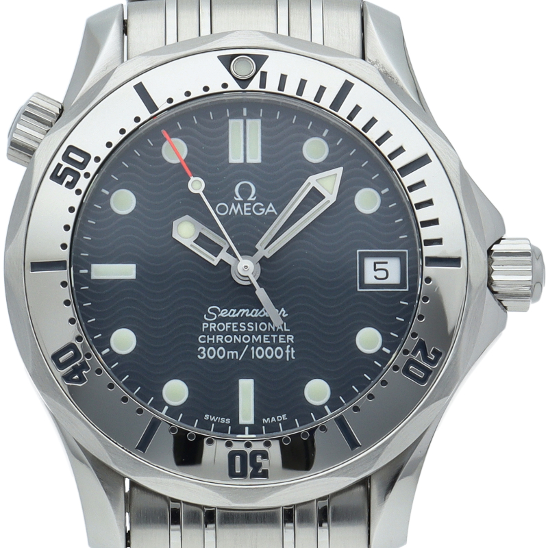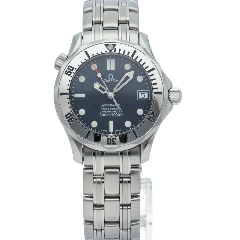 オメガを代表する人気ダイバーズウォッチ「シーマスター」。300mの防水性能を備え、文字盤には青い波の模様が入った実用性の高いベーシックなモデルです。