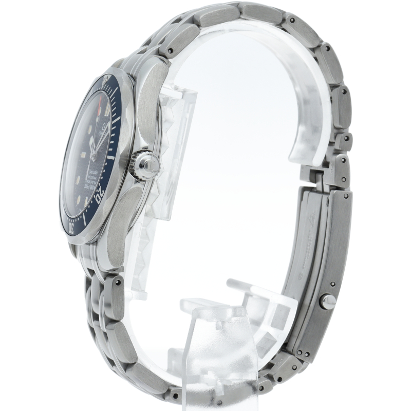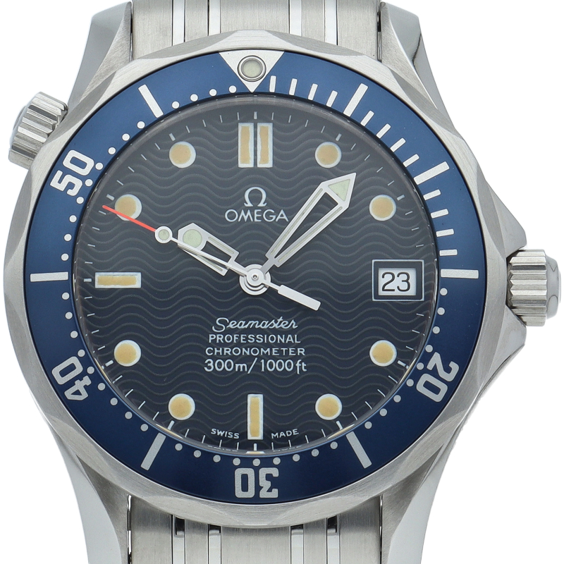 オメガを代表する人気ダイバーズウォッチ「シーマスター」。300mの防水性能を備え、文字盤には青い波の模様が入った実用性の高いベーシックなモデルです。