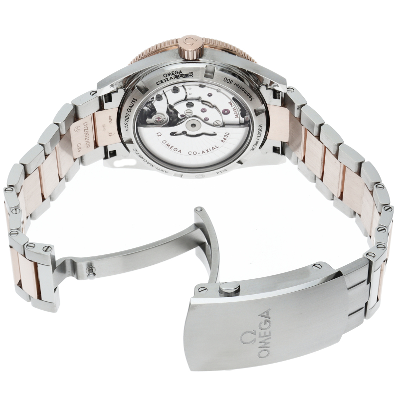 「シーマスター 300M マスター コーアクシャル」には、ヴィンテージのスーパールミノヴァを塗布した18Kピンクゴールドの針を備えたサンドブラスト仕上げのブラックダイアルが付属しています。ベゼルには、ポリッシュ仕上げされたセラミック製ベゼルリングとセラゴールド製ダイビングスケールがついています。