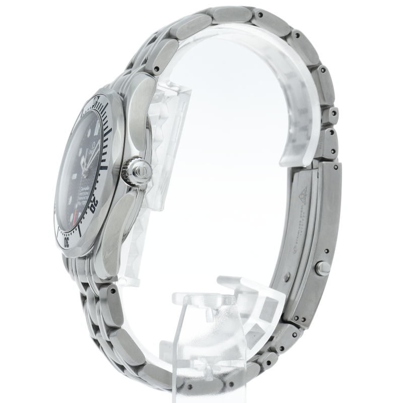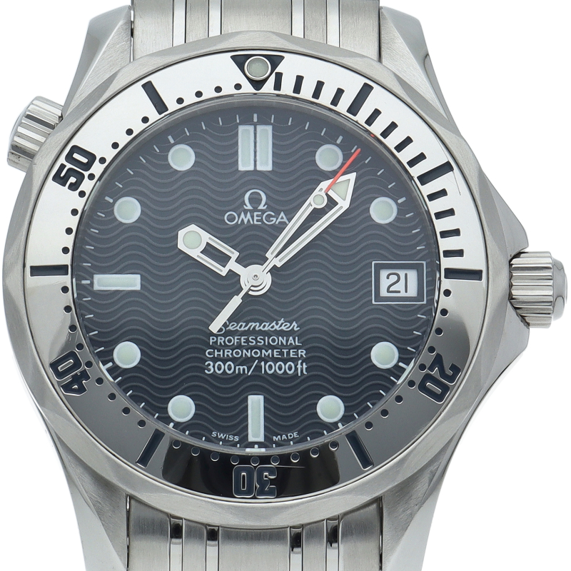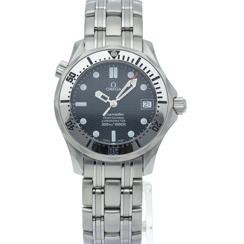 オメガを代表する人気ダイバーズウォッチ「シーマスター」。300mの防水性能を備え、文字盤には青い波の模様が入った実用性の高いベーシックなモデルです。