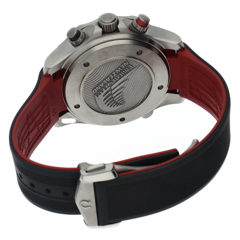 質感マットな漆黒セラミック製逆回転防止ベゼルやエスケープバルブを備えた厚さ17ミリ44ミリ300m防水ケースにチタンを採用して重さ120グラムに抑えたダイバー300Mは、世界最高峰のヨットレース「アメリカズカップ」に挑むヨットクルーETNZ・エミレーツチームニュージーランドをサポートするオメガの特別なダイバーズクロノグラフ。