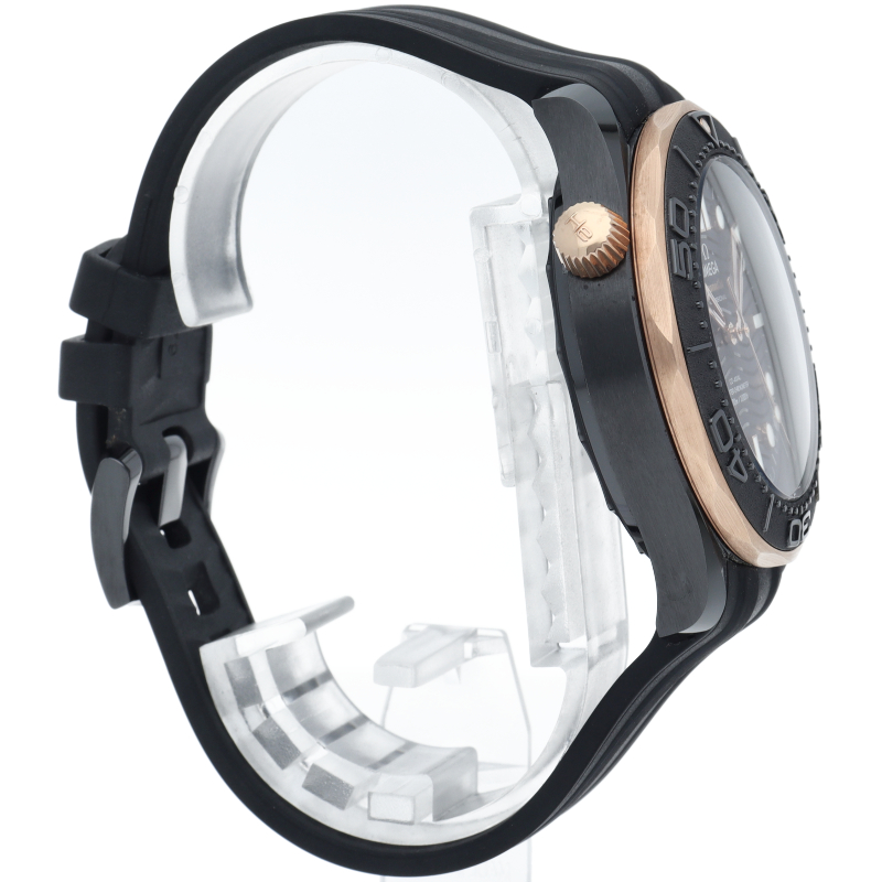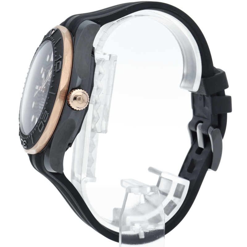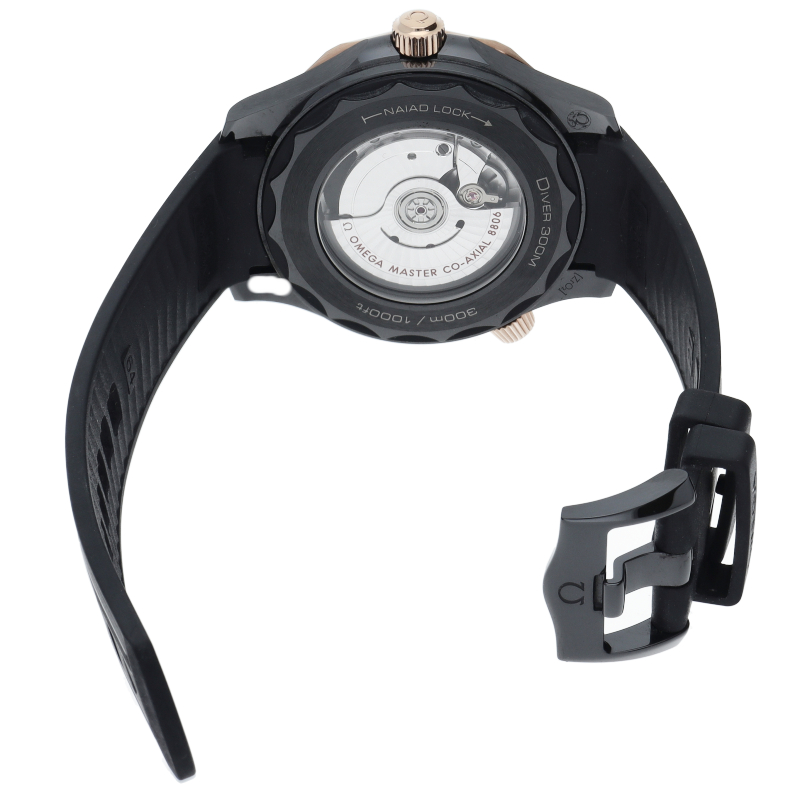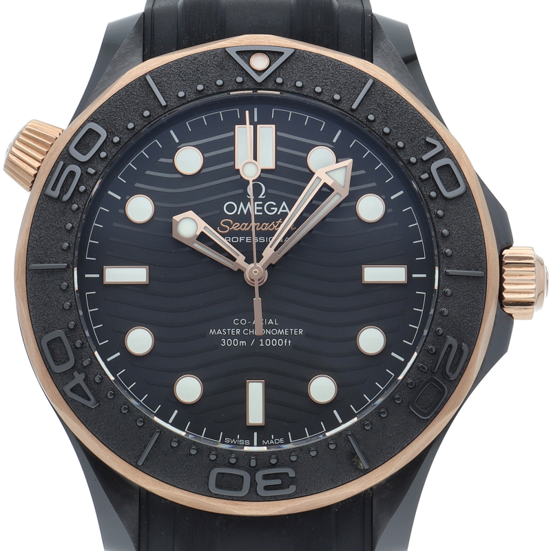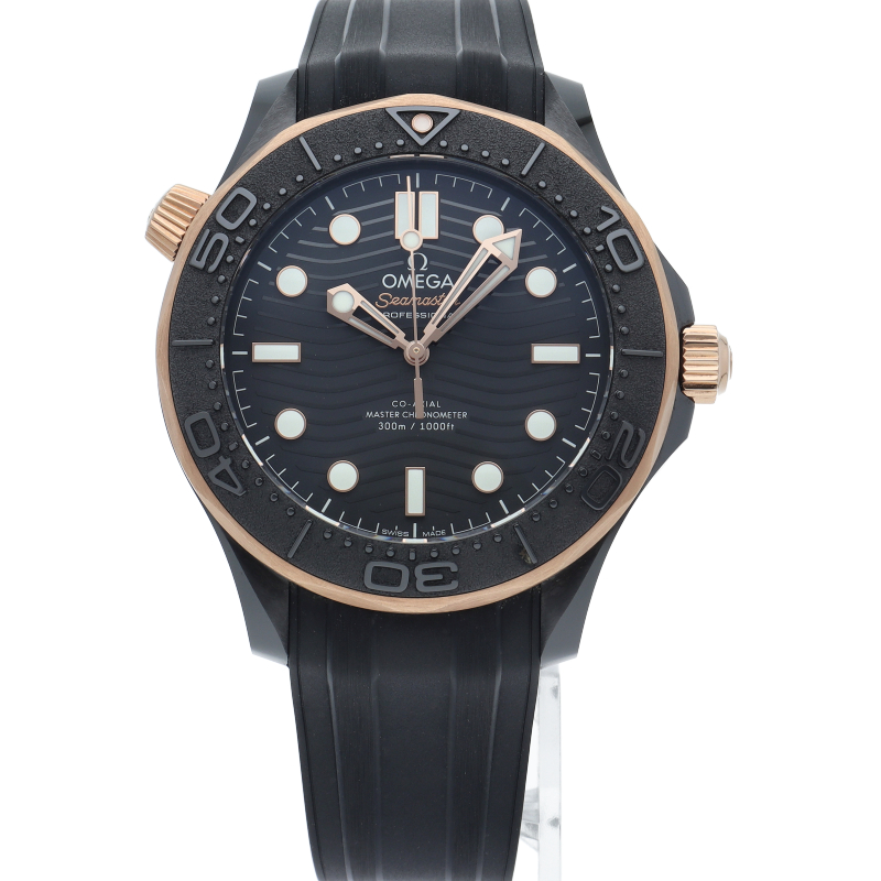 オメガ「シーマスター ダイバー300M」(210.62.44.20.01.001)。ブラックセラミックのケースに、18Kセドナゴールドを組み合わせたラグジュアリーな43.5mmモデル。波模様の黒文字盤とゴールドの対比が、圧倒的な色気と存在感を放ちます。傷に強く軽量な素材で実用性も高く、手元を華やかに格上げする大人のダイバーズです。