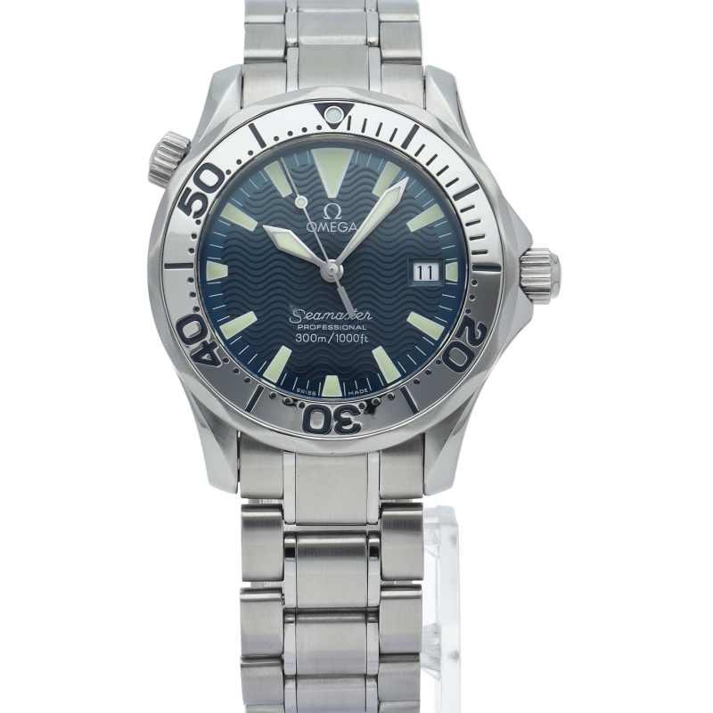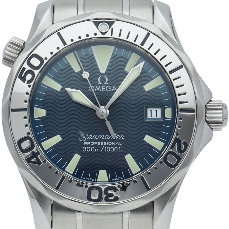 オメガを代表する人気ダイバーズウォッチ「シーマスター」。ヘリウムエスケープバルブを備えた本格的な多機能ダイバーズモデル。海を思わせるブルーのダイヤルが素敵です。