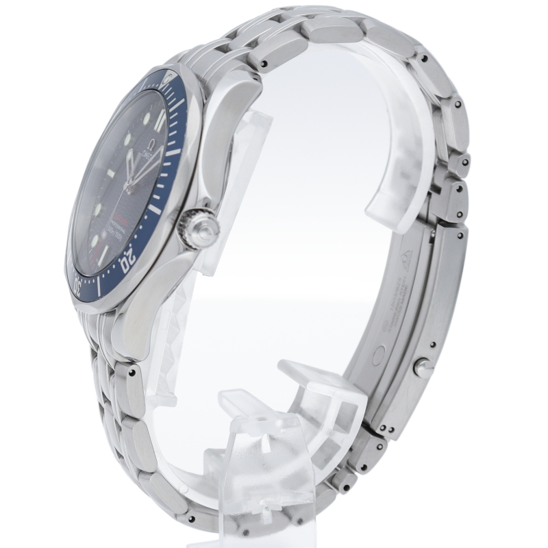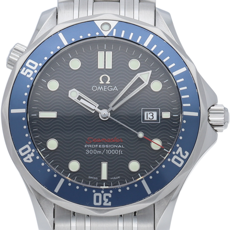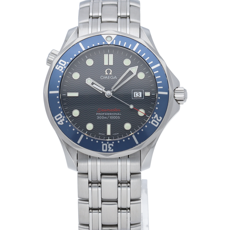 オメガを代表する人気ダイバーズウォッチ「シーマスター」。逆回転防止ベゼル・デイト表示機能等が搭載された本格派ダイバーズウォッチです。仕様変更により文字盤のシーマスターの文字が赤字に変更されております。