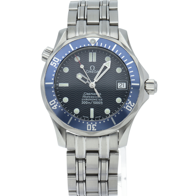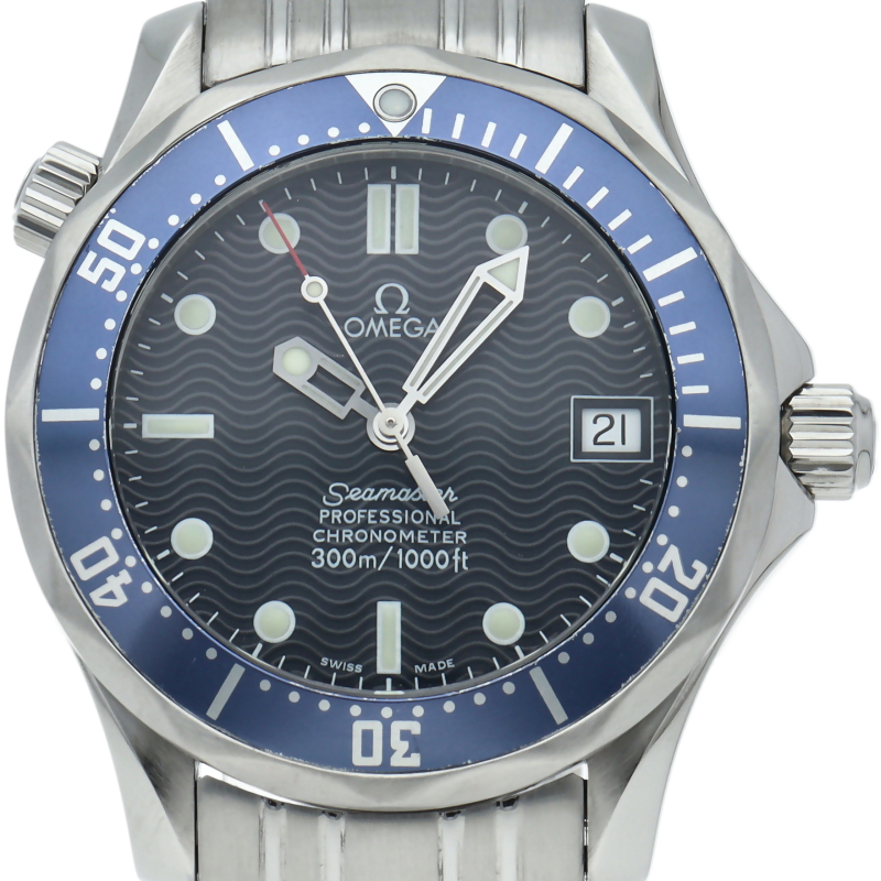 オメガを代表する人気ダイバーズウォッチ「シーマスター」。300mの防水性能を備え、文字盤には青い波の模様が入った実用性の高いベーシックなモデルです。
