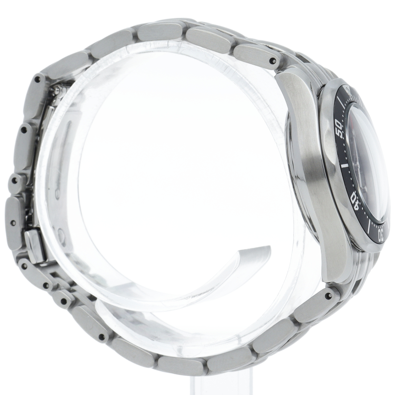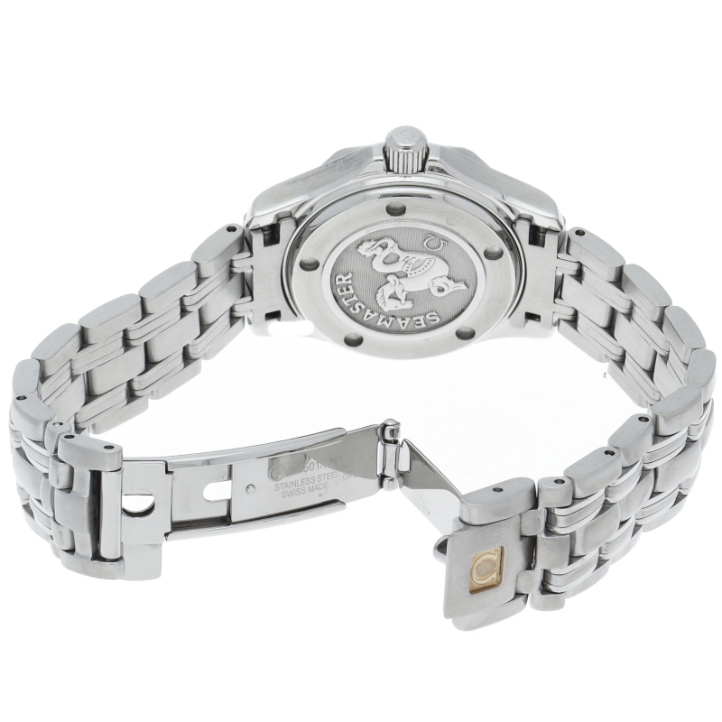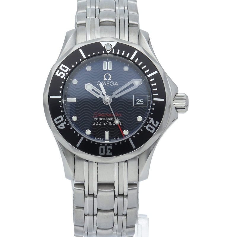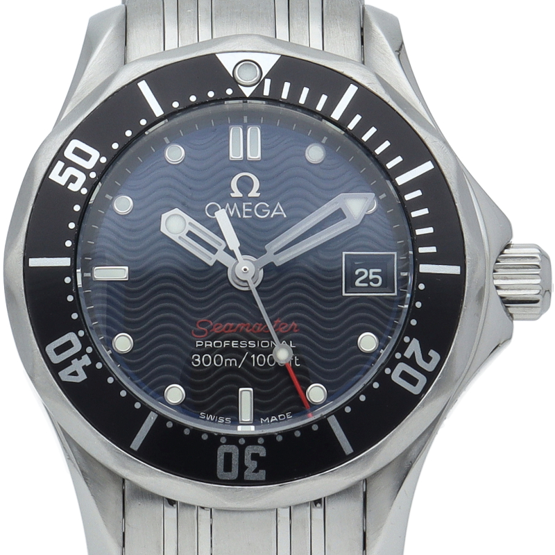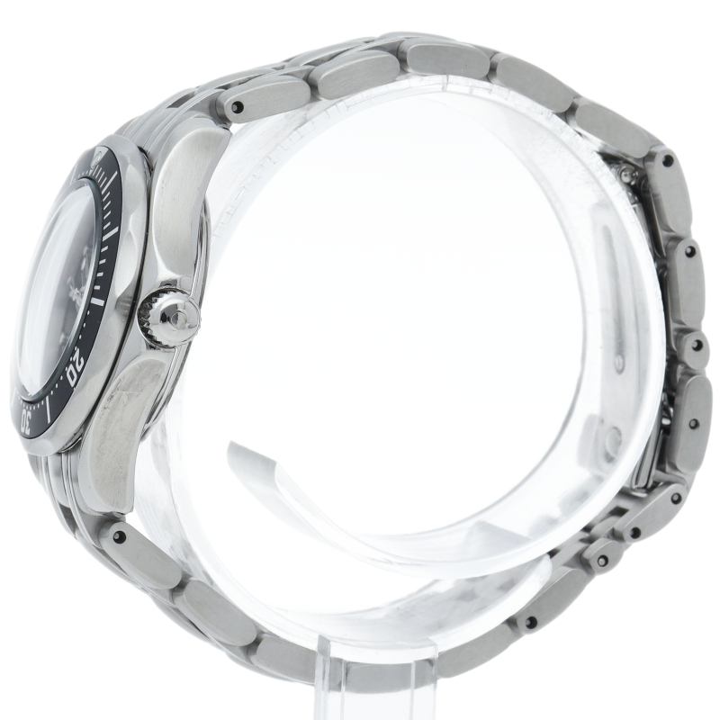 オメガを代表する人気ダイバーズウォッチ「シーマスター」。300mの防水性能を誇る本格ダイバーウォッチです。ブラック文字盤には波を模したギョーシェ模様が入れられ、このモデルの出自をイメージさせます。