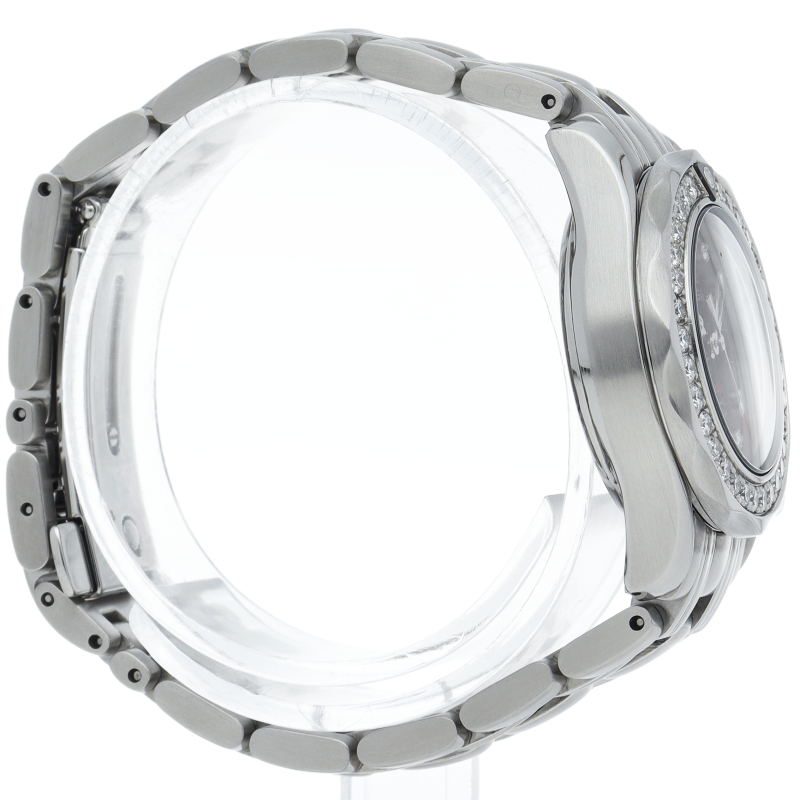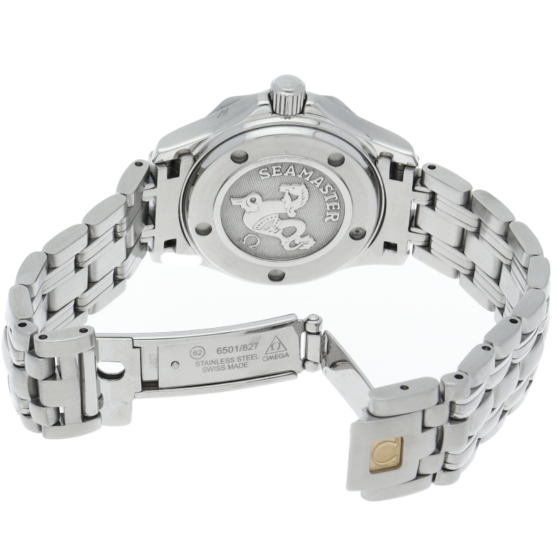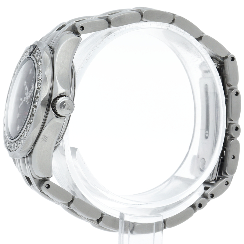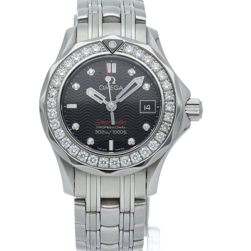 オメガの人気モデル「シーマスター」のレディースウォッチです。スポーティなデザインながらベゼルと文字盤に施されたダイヤモンドが豪華さを演出し、上品な印象を漂わせております。
