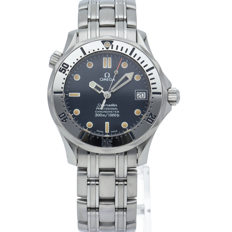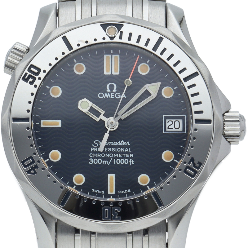 オメガを代表する人気ダイバーズウォッチ「シーマスター」。300mの防水性能を備え、文字盤には青い波の模様が入った実用性の高いベーシックなモデルです。