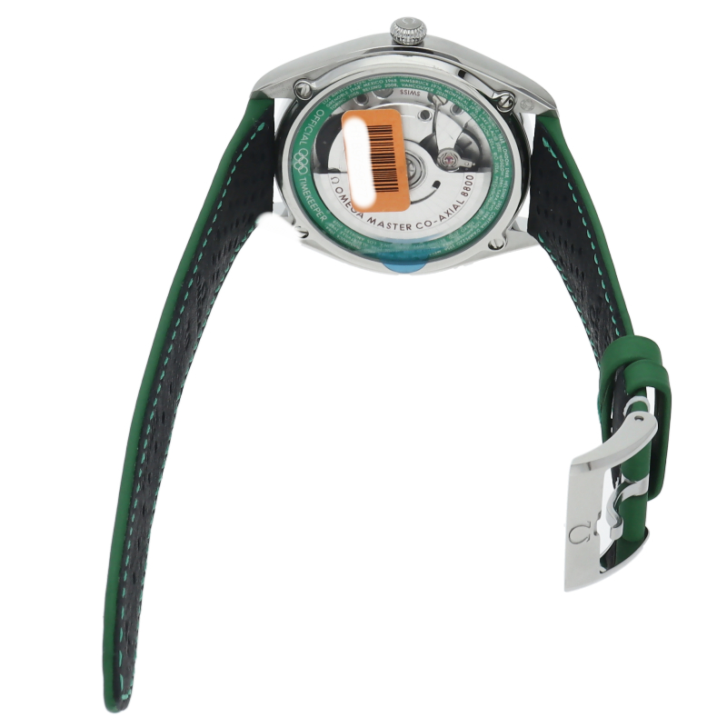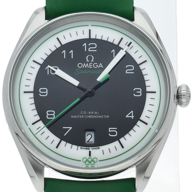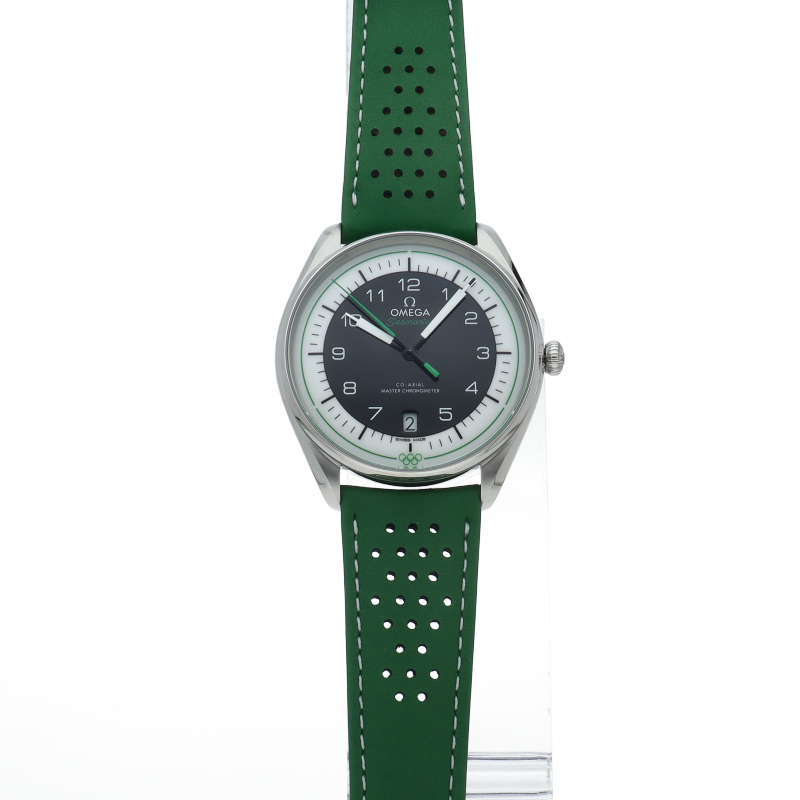 オメガが1932年から行っているオリンピックのオフィシャルタイムキーパーの2032年に100周年を迎えることを記念した特別なモデル五輪マークをモチーフとした5色からなるモデルでこちらはブラック1976年のモントリオール大会とインスブルック大会で使用されたストップウォッチがモチーフとなっています。ダイアル外周の円は、20秒間隔で3つに区切られており心拍数を簡単に計算することが可能です。