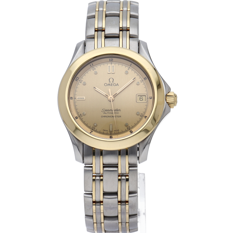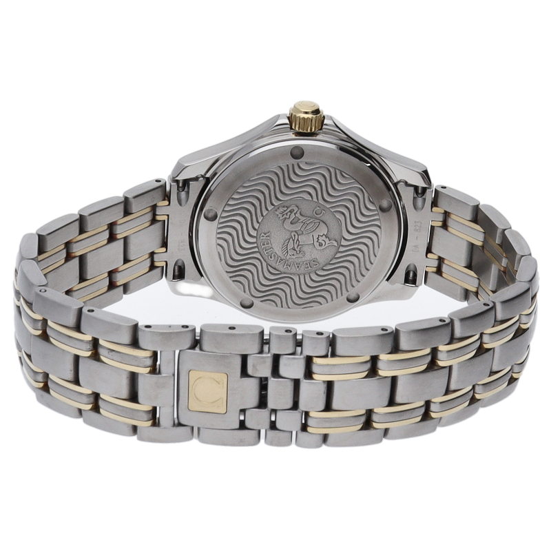 オメガを代表する人気ダイバーズウォッチ「シーマスター」。SS×YGコンビの華やかな仕上がりのモデルです。ブレスレットはポリッシュ仕上げとヘアライン仕上げのパーツが組み合わされた5連ブレスです。