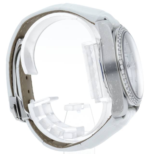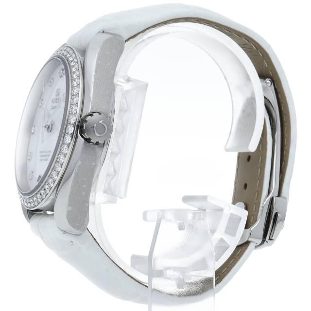 マザーオブパール文字盤にインデックスやベゼルのダイヤモンドが煌くエレガントな仕様です。ムーブメントは、15,000ガウス以上の耐磁性能を備えたマスター コーアクシャル キャリバー8500が搭載されています。