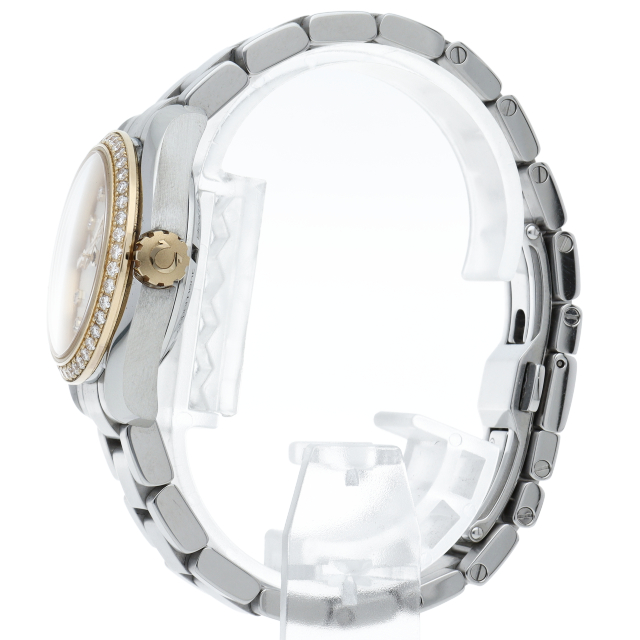 このモデルは、ホワイトマザーオブパールのダイアルに、 ダイヤモンドがセッティングされたインデックスと3時位置の日付窓が特徴です。「チークコンセプト」と呼ばれる縦縞装飾が施されたダイアルは、傷の付きにくいサファイア・クリスタル ガラスから眺めることができます。