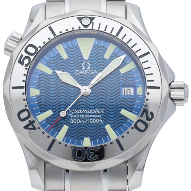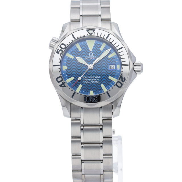 オメガを代表する人気ダイバーズウォッチ「シーマスター」。ヘリウムエスケープバルブを備えた本格的な多機能ダイバーズモデル。海を思わせるブルーのダイヤルが素敵です。
