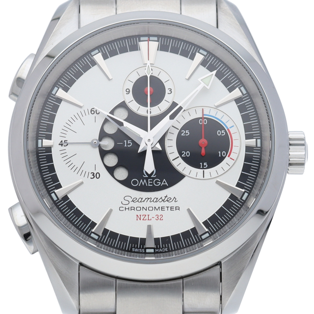 オメガを代表する人気ダイバーズウォッチで、カウントダウンヨットタイマーを搭載したシーマスターアクアテラクロノNZL-32です。1995年のアメリカズ・カップ優勝艇であるNZL-32の名を冠した限定モデルです。