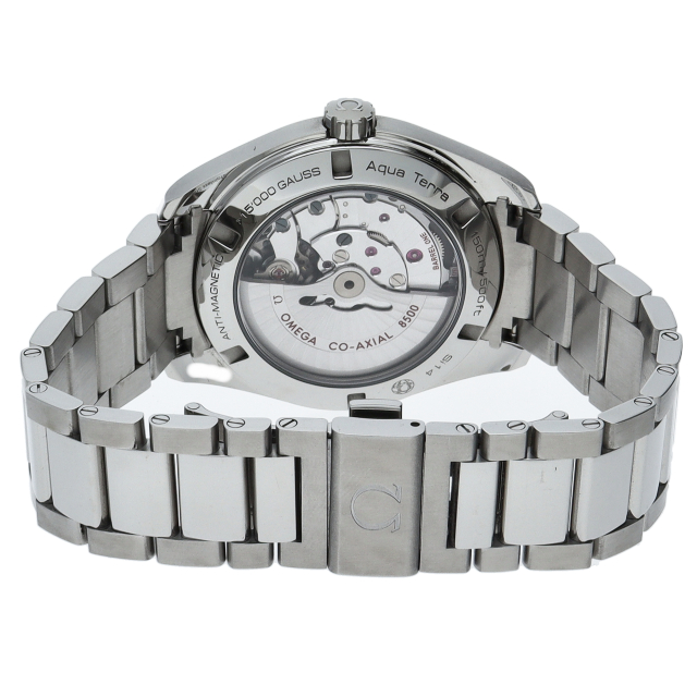 上品でどんなシーンでも使えるシンプルなデザインが特徴の「アクアテラ」。ブルーのダイアルには、中央にサンブラッシュ仕上げが施されており、波模様が転写されています。15,000ガウス以上の耐磁性能を備えたオメガ マスター コーアクシャル キャリバー8500搭載は、ケースバックから眺めることができます。