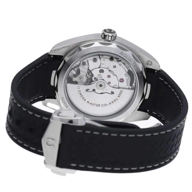 海に携わってきたオメガの長い歴史を代表する「シーマスター アクアテラ」 コレクション。シンメトリックな41mmのケースはステンレススティール製で、ケースバックにはウェーブ模様で縁取られたデザインが施されています。