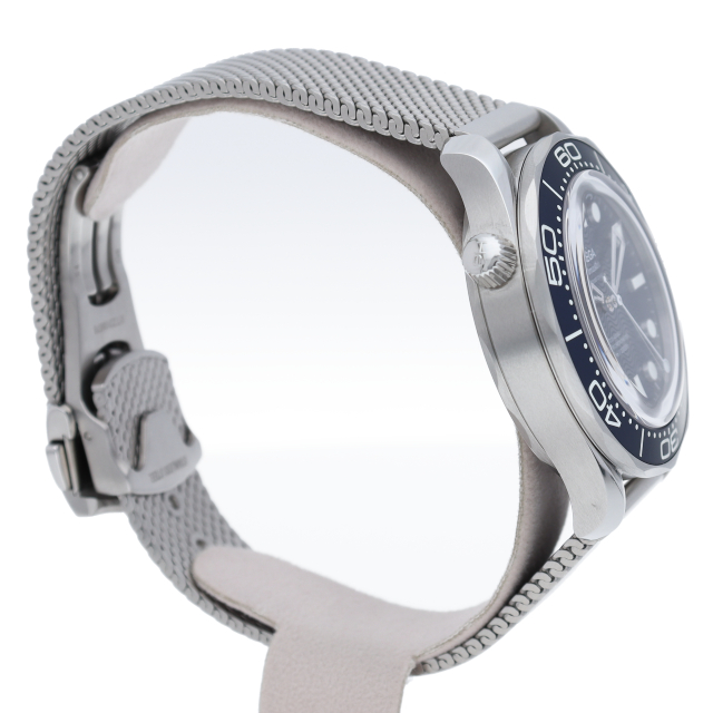 ジェームズ・ボンド60周年を記念して2022年に発表された、42mm径のステンレススティール製「シーマスター ダイバー300M」。1995年の映画『007/ゴールデンアイ』でジェームズ・ボンドが身に着けた「シーマスター ダイバー300M」にインスピレーションを得たこのモデルは、シュウ酸アルマイト処理を施したブルーのアルミニウム製ダイアルに、レーザーで波模様のエングレービングが施されたデザインです。