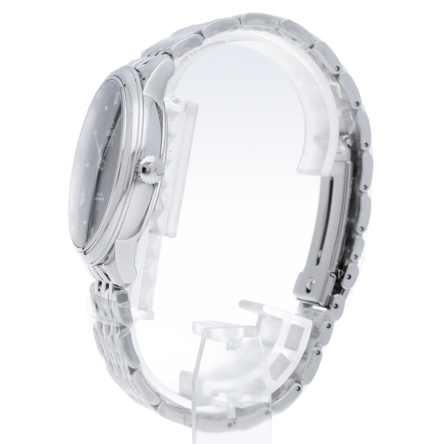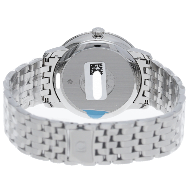 2019年に発表されたこの美しいタイムピースでは、結晶構造の文字盤が「デ・ヴィル プレステージ」のクラシカルでエレガントなデザインに立体感をもたらしています。ブラックのパターン入りダイアルには、ロジウムプレート加工が施されたインデックスと針、転写されたのマーク、6時位置に日付窓が配されています。オメガ コーアクシャル キャリバー2500を搭載。